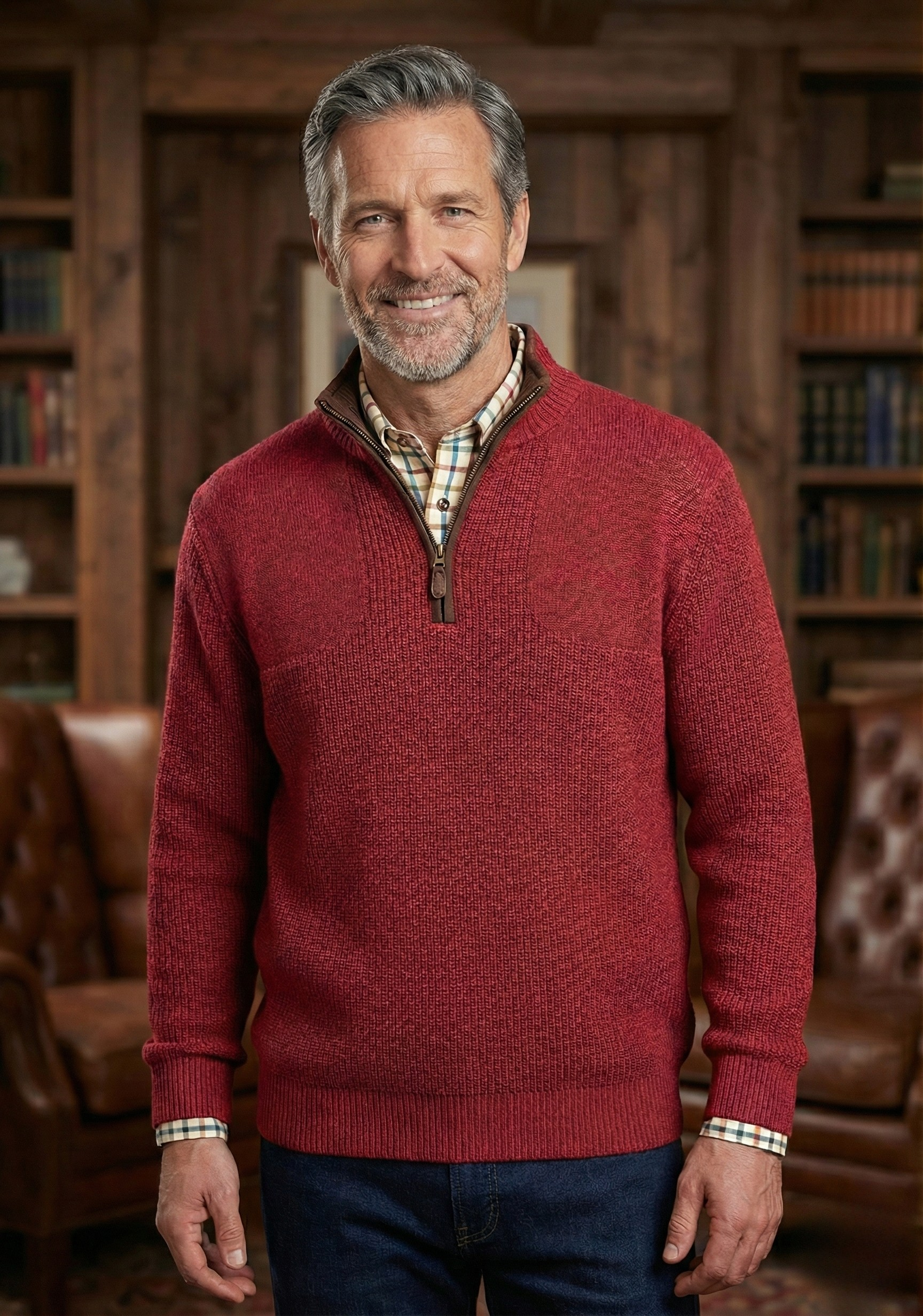 The Details: The quarter-zip neckline is finished with genuine brown leather trim and a brass zipper pull, adding a touch of luxury and durability.