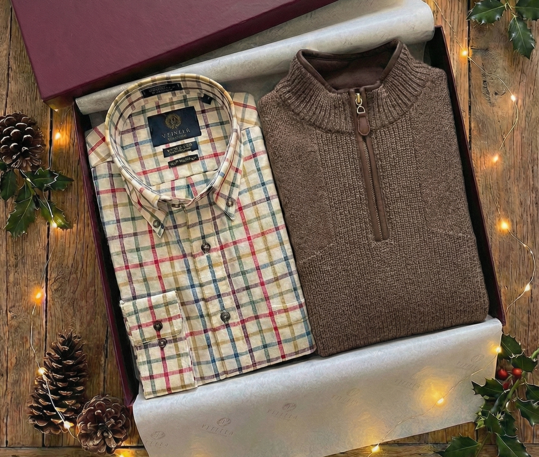 This gift set is designed for the gentleman who values classic British tailoring, warmth, and versatility. It pairs Viyella’s signature shirt blend with a rugged yet refined layering piece, creating a complete outfit ready for family gatherings or a weekend at the lodge.