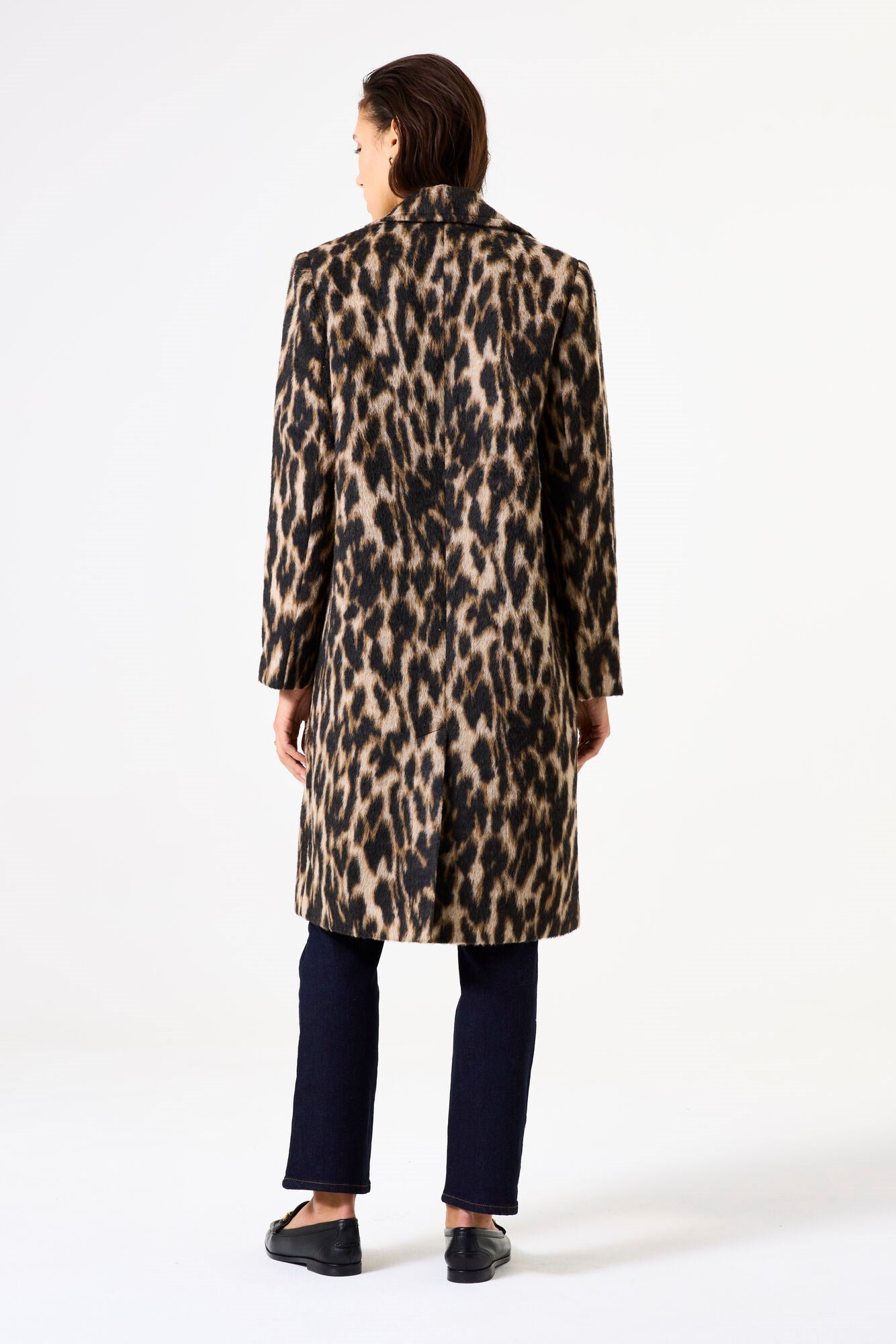 Mid-length coat made from a wool blend with an all-over leopard print. This jacket features long sleeves, an oversized collar, a button closure, and a relaxed fit. Additionally, this jacket has a length that reaches above the knee and a split at the back, providing a classic look with a modern twist. The outer layer of this jacket is made from 80% polyester and 20% wool.