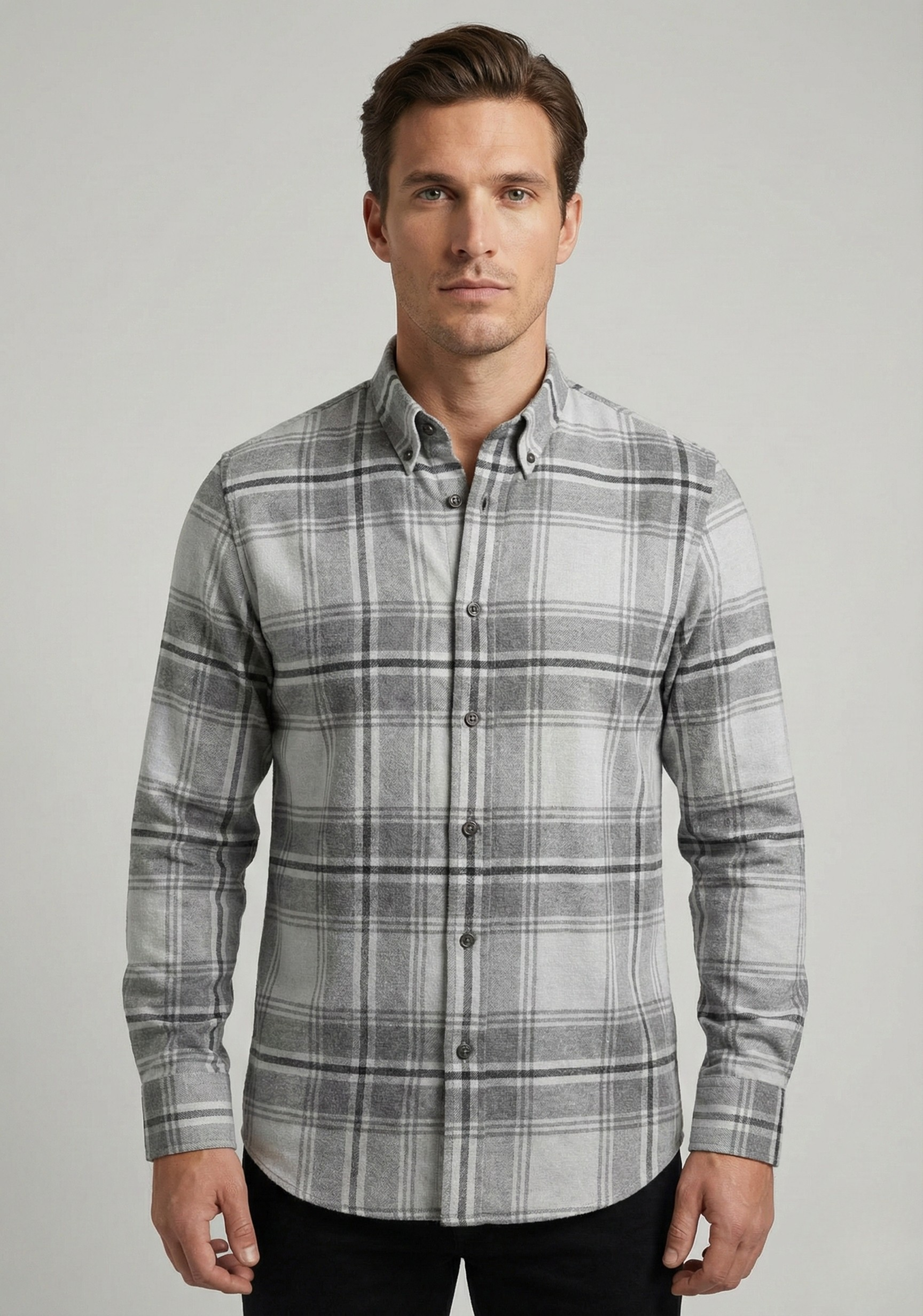 Leo Chevalier Brushed Cotton Large Grey Plaid Long Sleeve Shirt